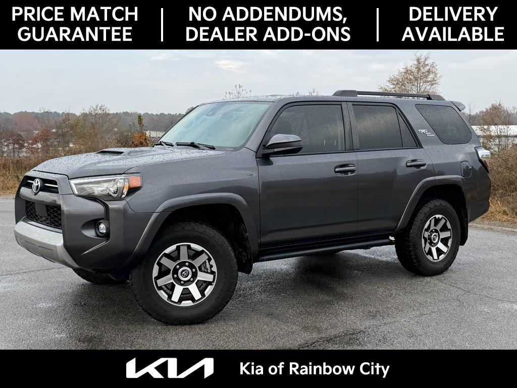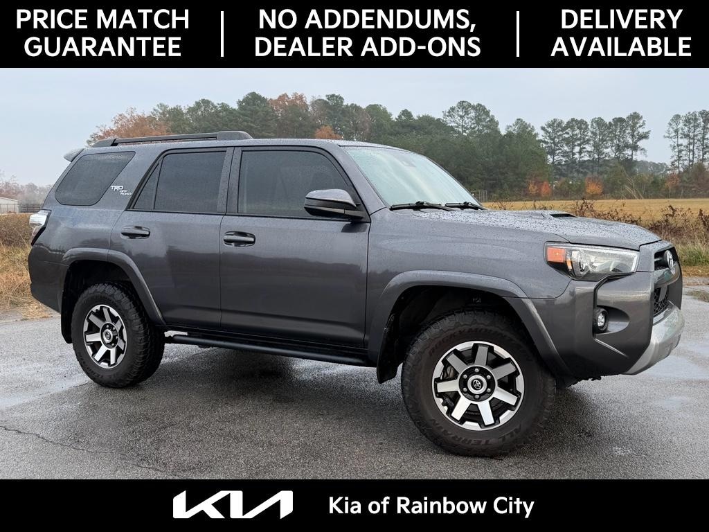 2021 Toyota 4Runner TRD Off Road â€" 4WD V6 4.0L Gasoline â€" Rainbow City, AL. This rugged, reliable SUV combines legendary Toyota durability with serious off-road capability and modern convenience. Equipped with the Off-Road Package, the TRD-tuned suspension, skid plates, and multi-terrain traction features make tackling trails and rough terrain effortless. The powerful 4.0L V6 delivers confident acceleration whether you're navigating mountain roads or cruising the interstate. Inside, enjoy smart connectivity with Android Auto and Hands-Free Bluetooth for seamless phone integration and music streaming. The Back-Up Camera enhances safety and maneuverability in tight spots, while the spacious interior and versatile cargo area provide room for gear, family, and weekend adventures. This Toyota 4Runner comes with CARFAX 1-Owner history, reflecting careful ownership and solid maintenance. Located in Rainbow City, AL, this 2021 Toyota 4Runner TRD Off Road is priced to sell â€" offering the best price in the area for a vehicle of this quality and capability. Don't miss your chance to own a highly capable 4WD SUV with proven off-road credentials, modern tech features, and a clean ownership record. Contact us today for a test drive and see why this Toyota 4Runner is the smart choice for drivers who want performance, reliability, and value all in one package.